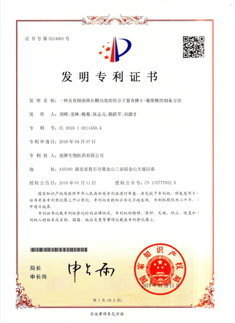 1月11日,由胡輝、龍林、梅菊、陳志元、楊躍軍、劉源才6人提出的《一種具有輔助降血糖功效的低分子量青稞β-葡聚糖的制備方法》獲得發明專利。該專利為勁牌公司2019年自然年度獲批的第一項發明專利。