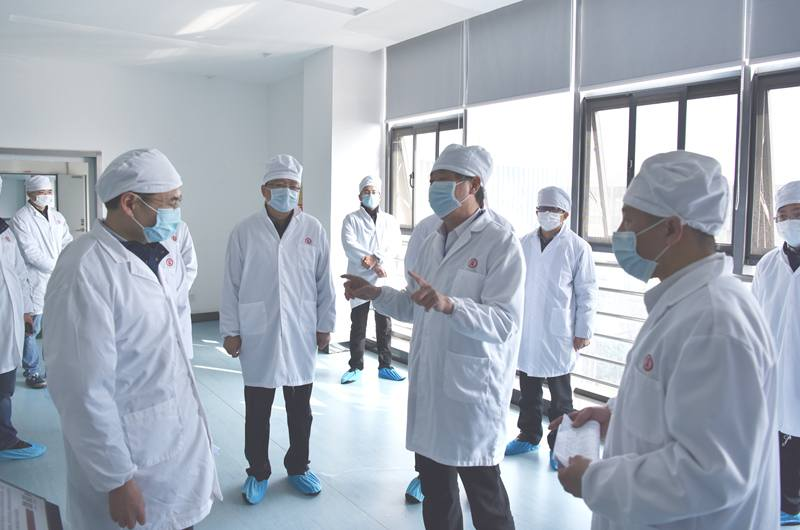 惠建林一行先后參觀了勁牌持正堂藥業國醫館、檢測實驗室、中藥提取一車間、中藥配方顆粒智慧藥房和中藥顆粒劑車間。參觀過程中,惠建林詳細詢問了用于新冠肺炎的中藥預防二號方、“清肺排毒湯”和“肺炎1號”治療方的生產情況,并對藥品配方、藥材檢測、生產設備、工藝流程等進行了深入了解。